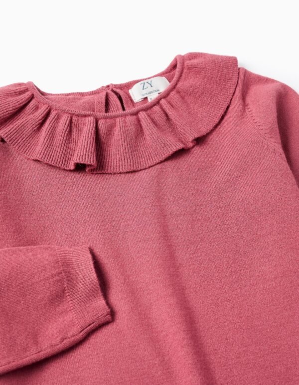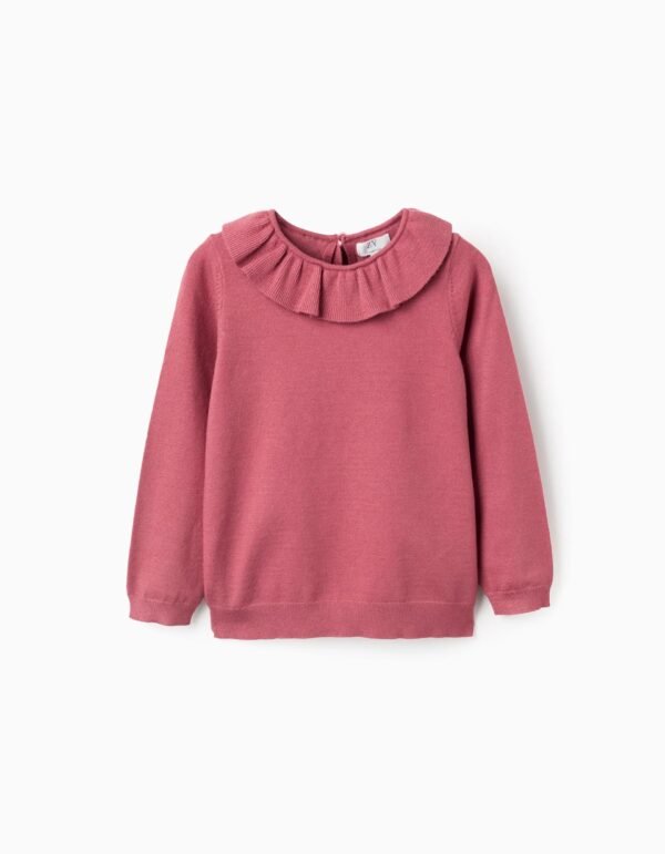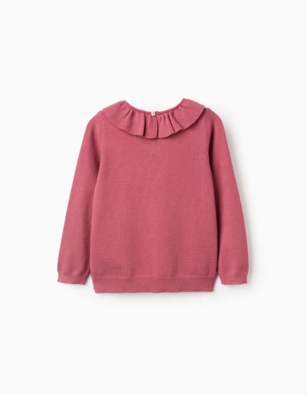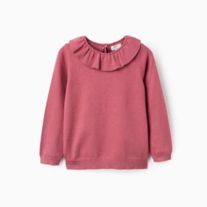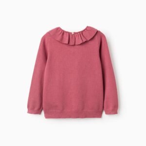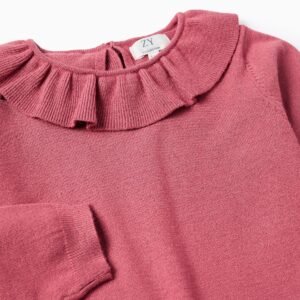 Jersey de punto fino rosa para niña, con cuello de volantes. Extremos acanalados para un ajuste perfecto. Botón en la espalda para vestir fácilmente. Una opción suave, cómoda y versátil.