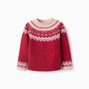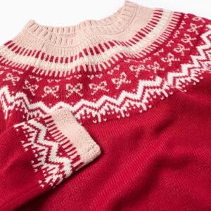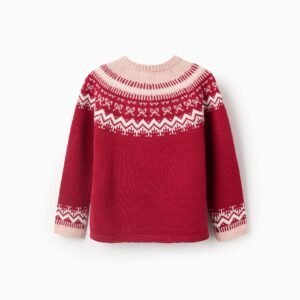 Jersey de punto rojo para niña, con jacquard rosa y blanco en el pecho y las mangas. Corte evasé. Mangas raglán. ¡Vintage pero siempre actual!