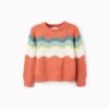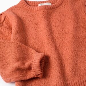 Jersey de punto calado naranja para niña, suave y cómodo. Hombros caídos y mangas ligeramente abullonadas. Extremos acanalados para un ajuste perfecto.