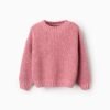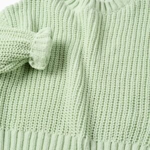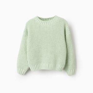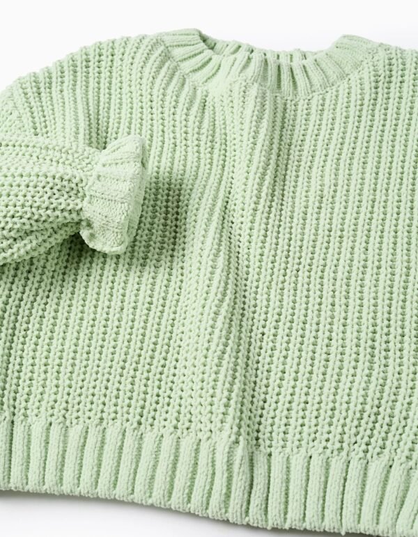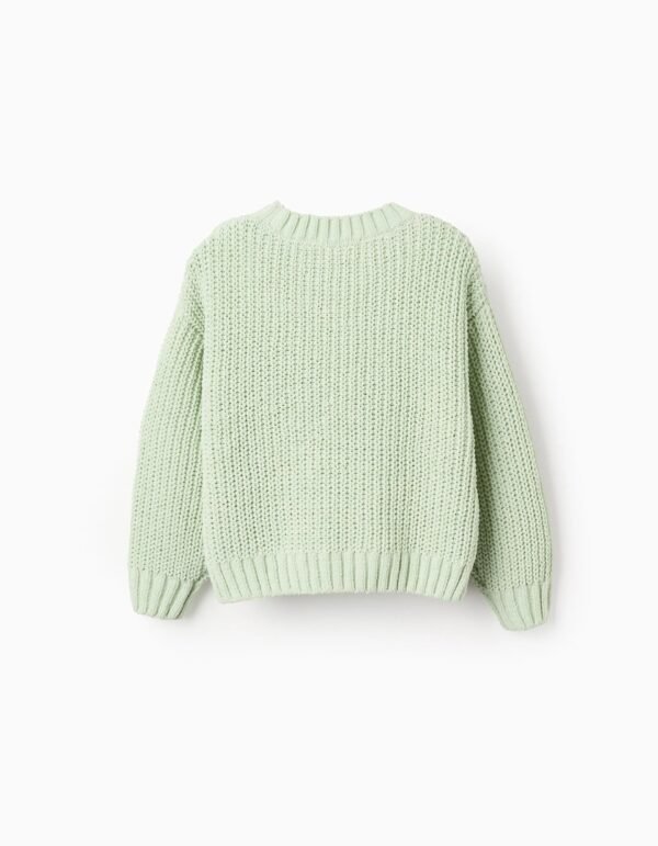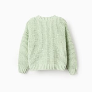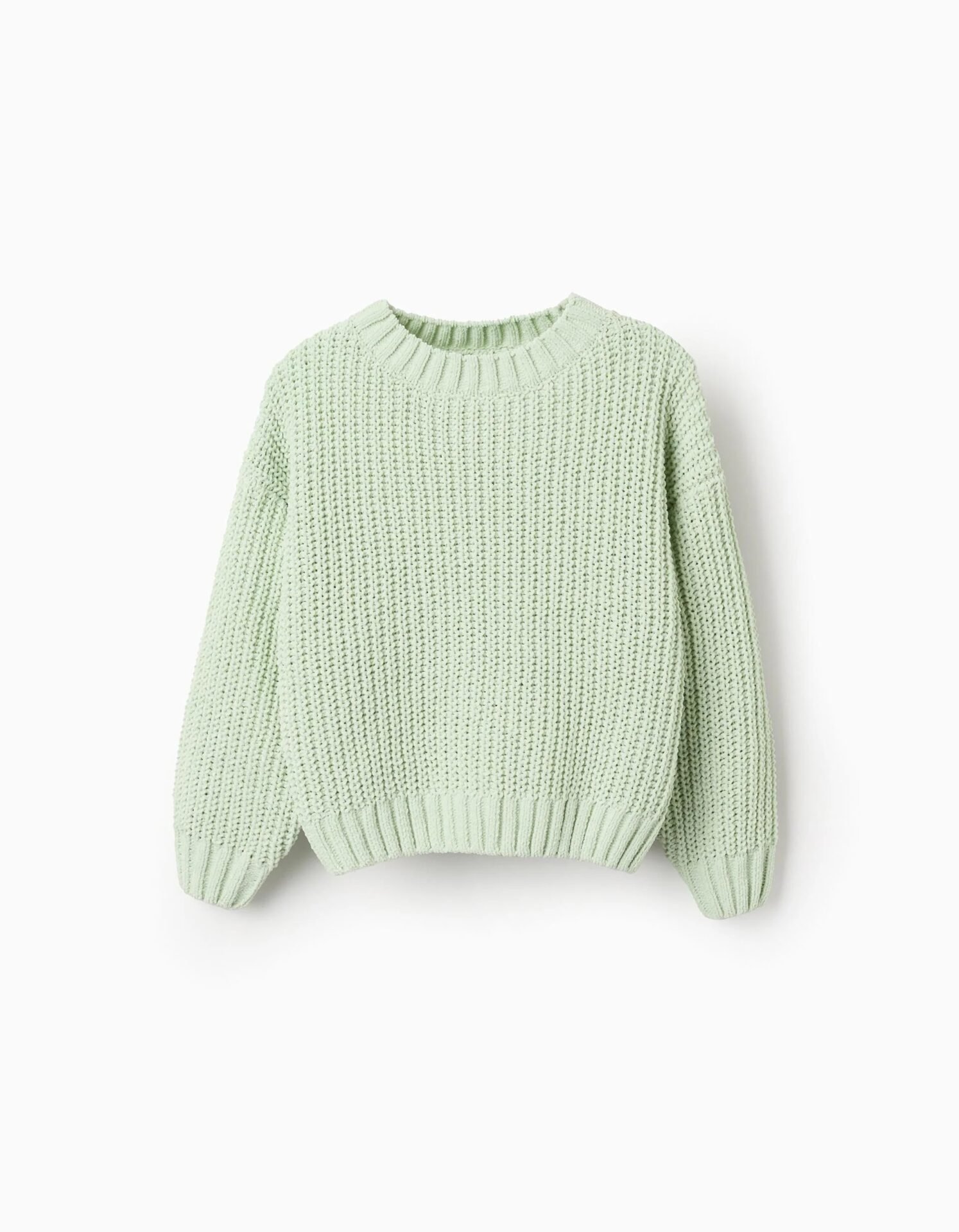 Jersey de punto chenille verde para niña, suave y flexible. Hombros caídos y extremos acanalados. Corte amplio y relajado