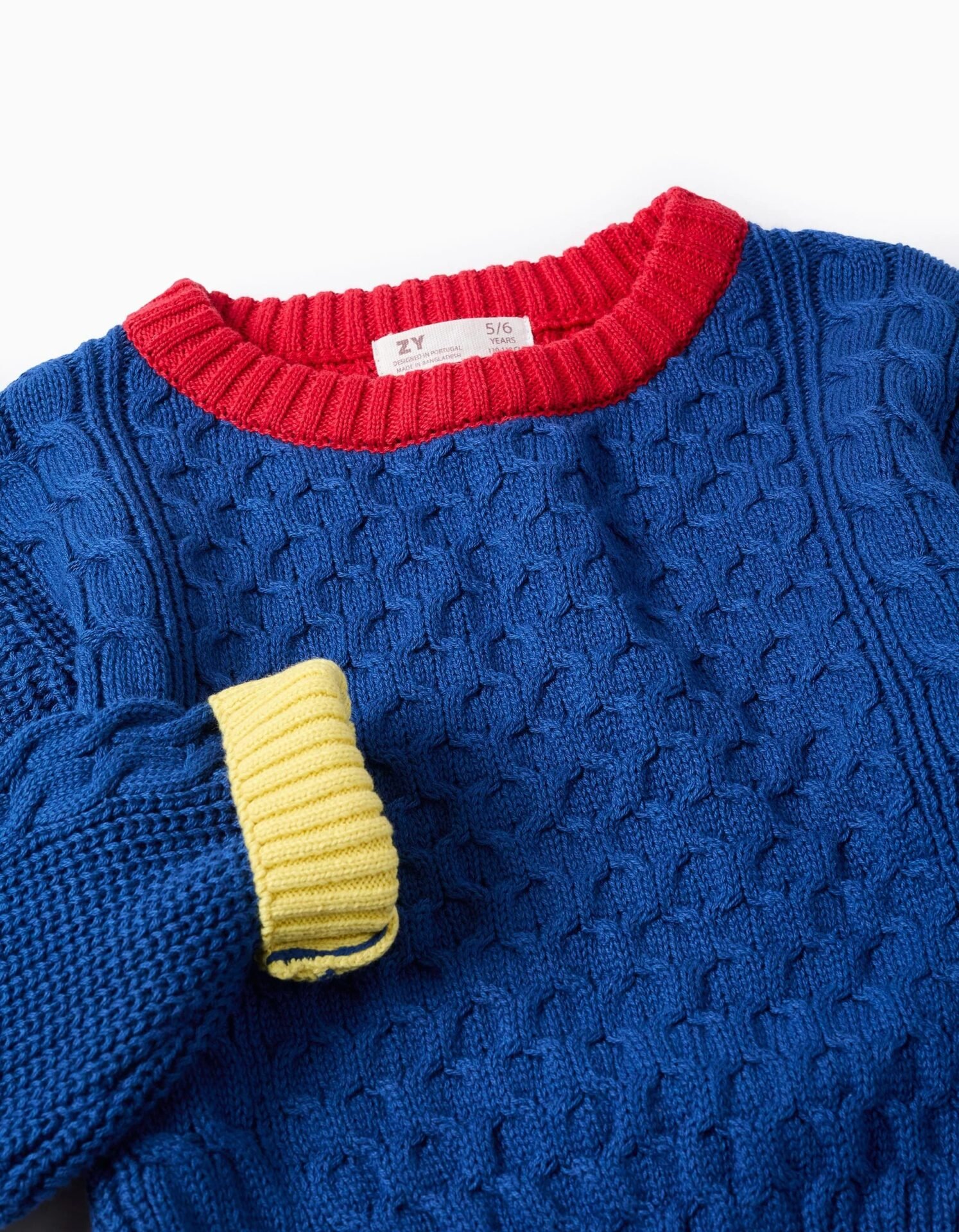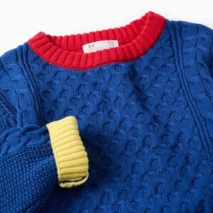 Jersey de punto multicolor para niña, 100% algodón. Parte delantera azul, cuello y espalda rojos, un puño rosa y otro amarillo. Detalles de punto con efectos en relieve. Hombros caídos. Dobladillo con aberturas a los lados para un look fluido. Una opción original y colorida para un look con un toque vintage.
