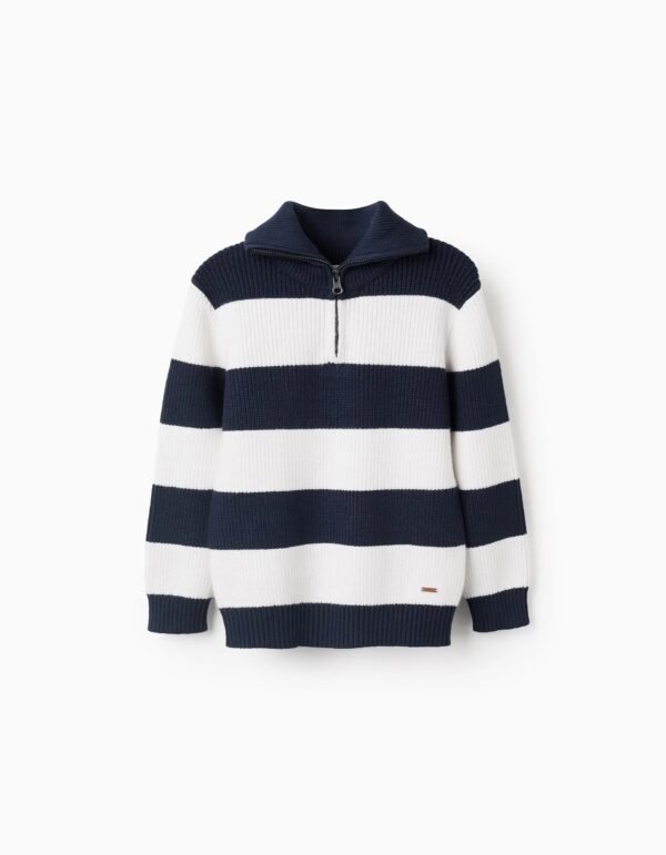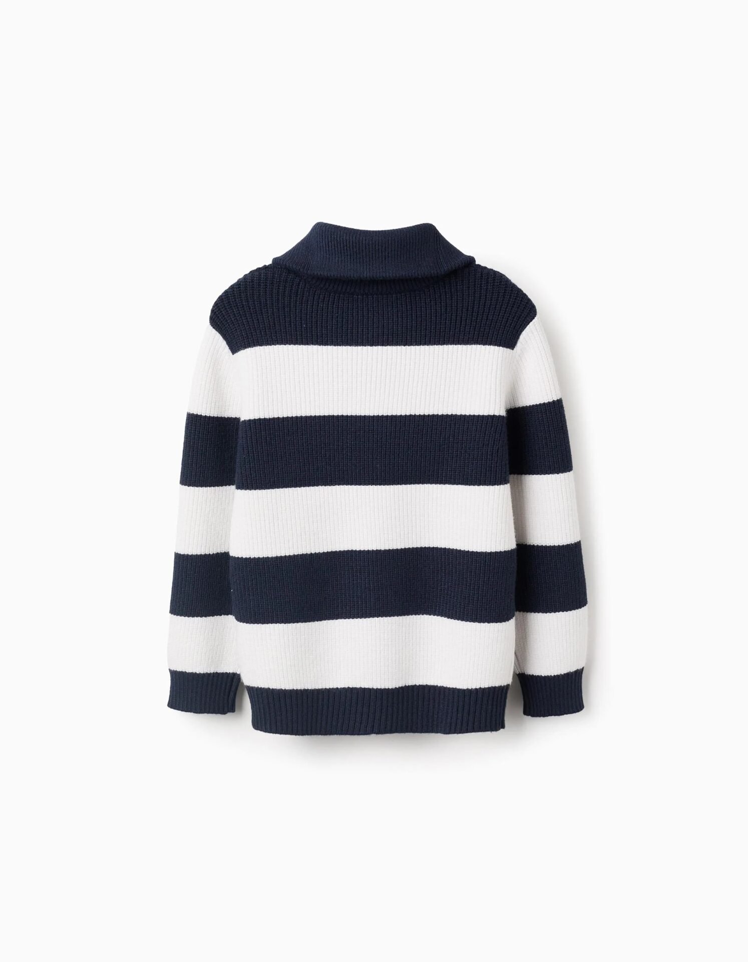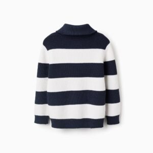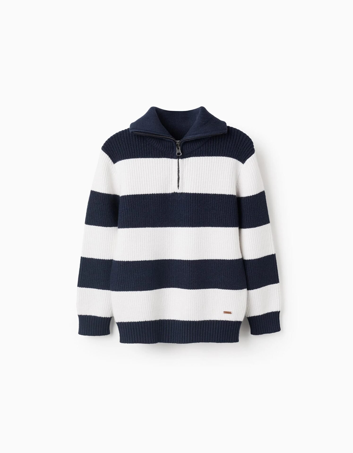 Jersey de punto de canalé a rayas blancas y azul oscuro para niño. Cuello con cierre de cremallera. Extremos de canalé para un ajuste perfecto. ¡Una opción suave, acogedora y flexible, para todos los estilos!
