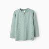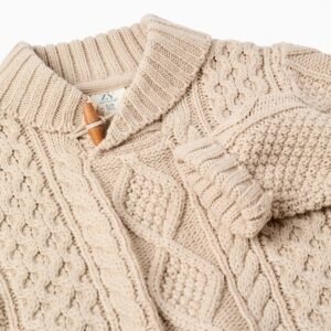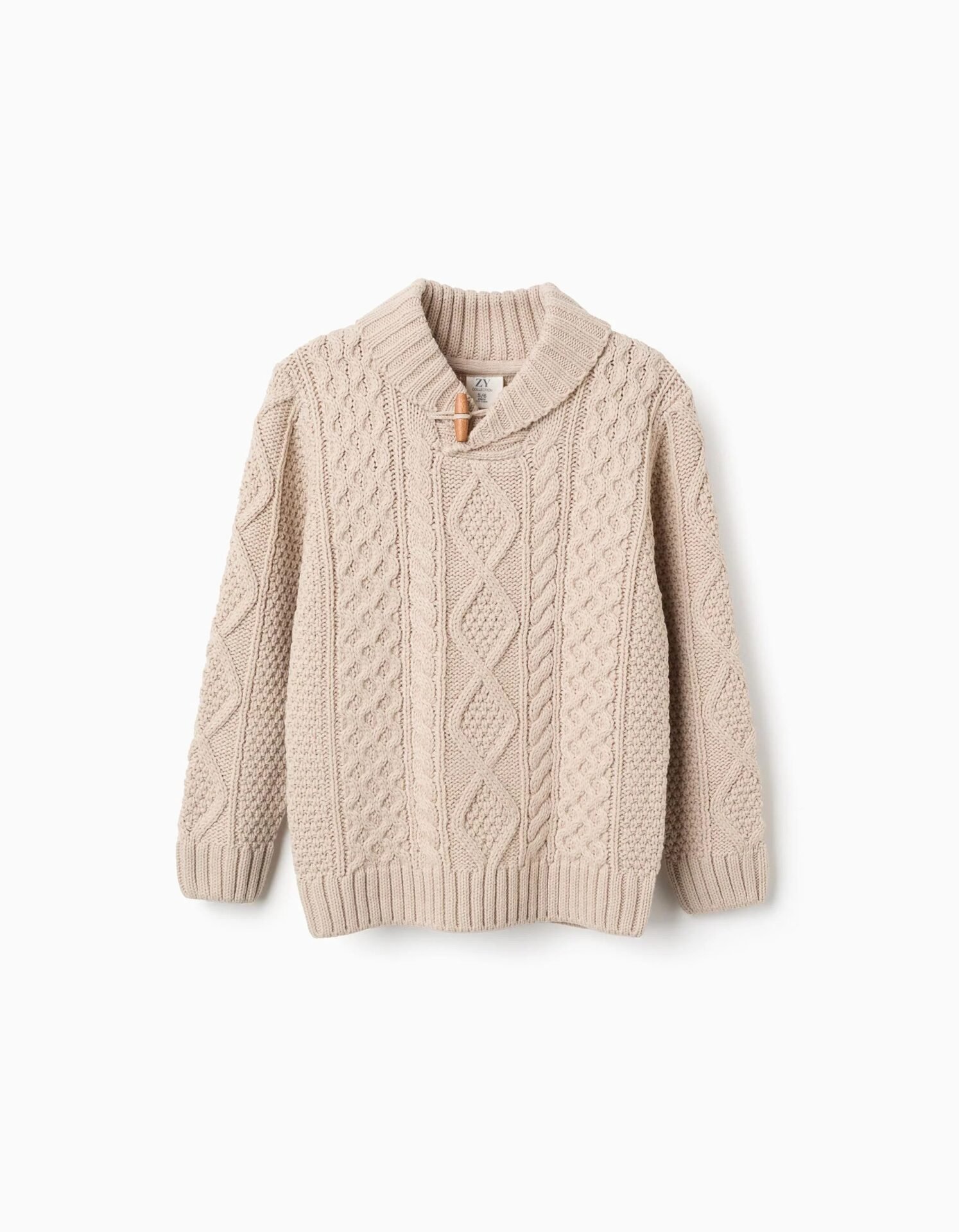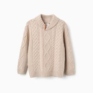 Jersey beige de punto grueso trenzado para niño. Cuello esmoquin acanalado con botón de palanca de madera. Puños y bajo acanalados para un ajuste perfecto. ¡Un jersey clásico y elegante, perfecto para los paseos invernales!
