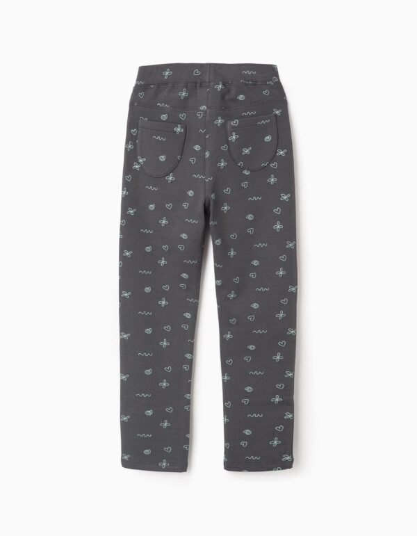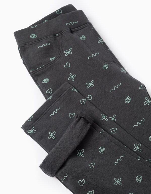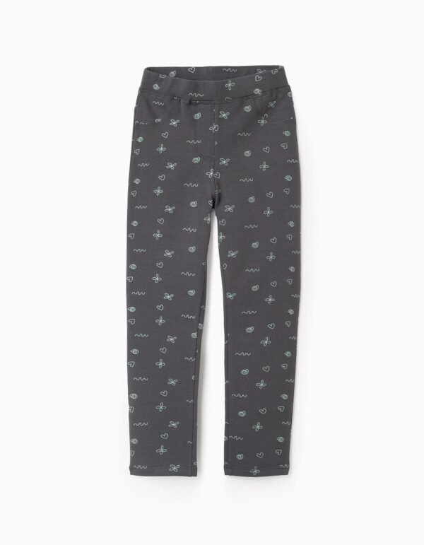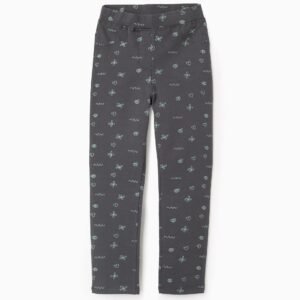 Jegging gris oscuro perchado para niña, en algodón con un toque de elasticidad para mayor comodidad y libertad de movimientos. Con motivo diversificado en tonos de verde. Cintura elástica, ajustable en el interior con elásticos y botones. Bolsillos frontales decorativos y bolsillos traseros funcionales. ¡Una opción práctica y cómoda para el día a día!