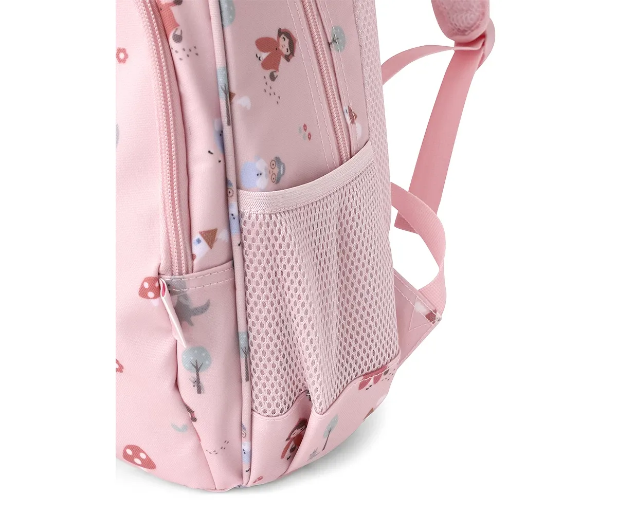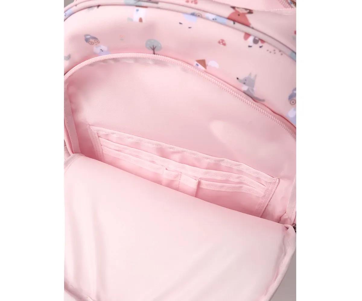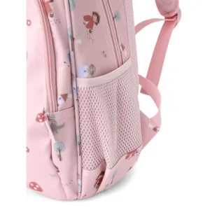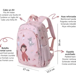 Un bolsillo frontal, que ocupa casi la altura de la mochila, con múltiples separadores interiores donde guardar lápices,cubiertos y pequeños artículos, que los peques tendrán más accesible