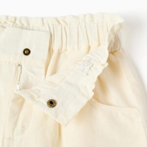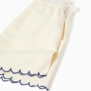 Perfecto para los días soleados, este pantalón corto beige claro para niña garantiza comodidad en todo momento. Fabricado en una mezcla de tejidos suaves, destaca por el elegante dobladillo festoneado azul oscuro. Fácil de cuidar, este pantalón corto combinará fácilmente con varias camisetas y blusas, ¡para looks elegantes y frescos!