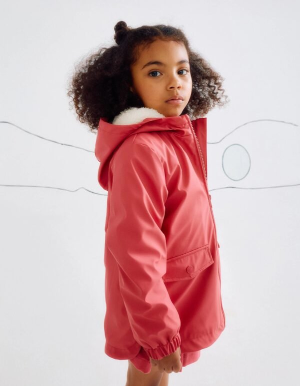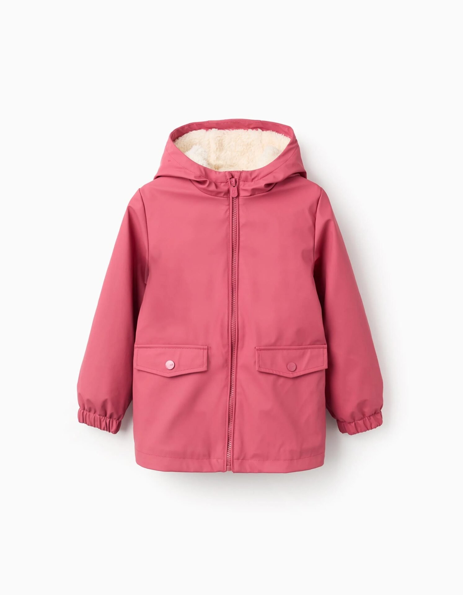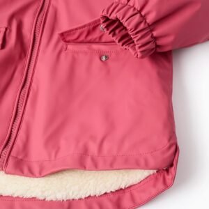 Parka de goma rosa oscura para niña. Con capucha y forro de sherpa para mayor confort térmico. Bolsillos con automáticos. Cierre con cremallera para vestirse fácilmente. Puños elásticos. Etiqueta interior para el nombre de la niña. We Care: esta prenda está rellena de poliéster reciclado. El abrigo perfecto para los meses de invierno.
