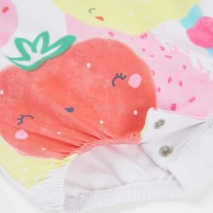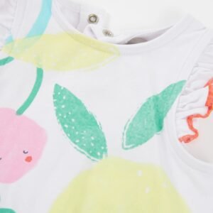 Pelele para niña con un alegre estampado de frutas en tonos vibrantes. Presenta volantes en los hombros con un delicado ribete en contraste y cierre con automáticos en la parte trasera para facilitar la puesta. Los camales llevan goma elástica para asegurar una mayor comodidad y un ajuste suave. Una prenda fresca, ligera y perfecta para los días de verano.