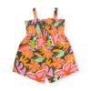 Pelele para niña con un alegre estampado de frutas en tonos vibrantes. Presenta volantes en los hombros con un delicado ribete en contraste y cierre con automáticos en la parte trasera para facilitar la puesta. Los camales llevan goma elástica para asegurar una mayor comodidad y un ajuste suave. Una prenda fresca, ligera y perfecta para los días de verano.