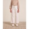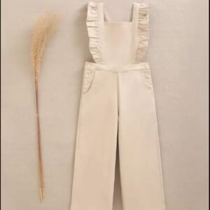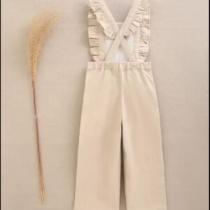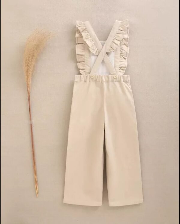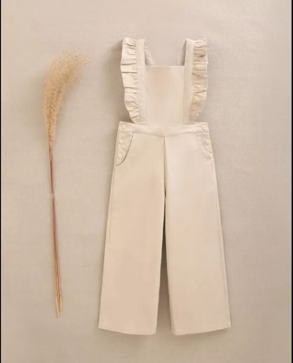 Peto largo de niña beige con bolsillos, tejido elástico, tirantes ajustables con volantes y botones de madera en los laterales, cómodo y práctico.