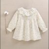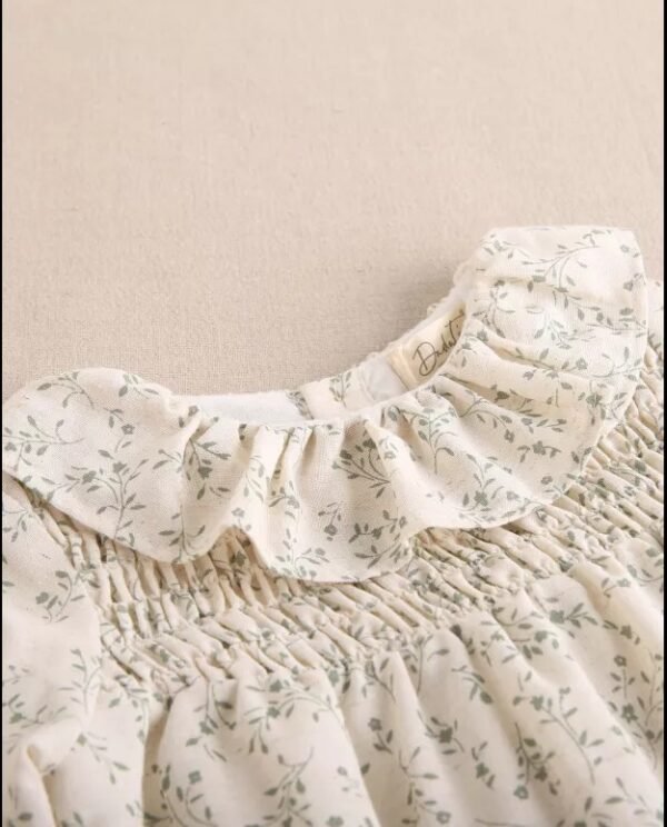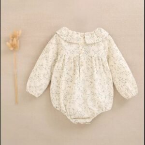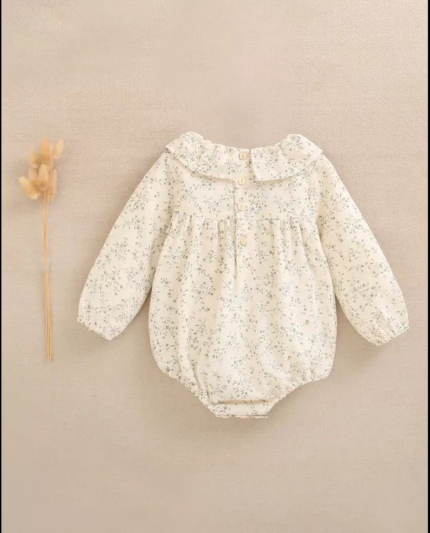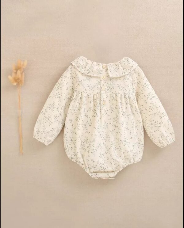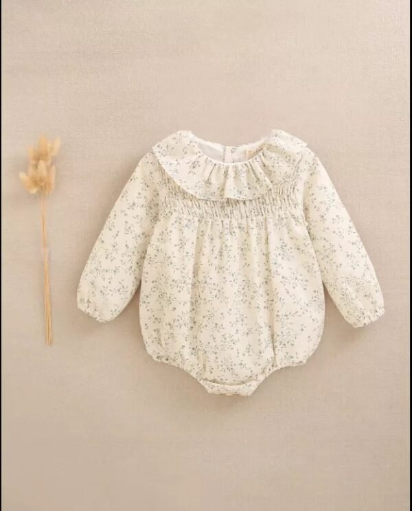 Ranita de bebé niña crudo con estampado floral verde, volante en cuello y nido de abeja en parte delantera, manga larga y cierre con botones de madera.