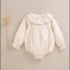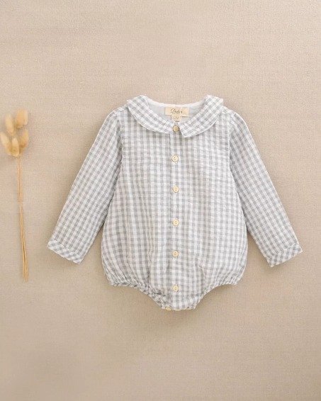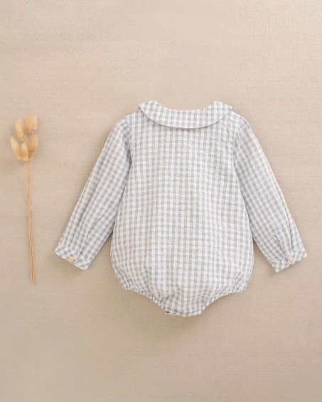 Ranita de bebé niño de cuadros vichy gris y blanco, manga larga, cuello redondo y cierre delantero con botones de madera, adorable y cómoda.
