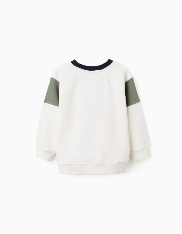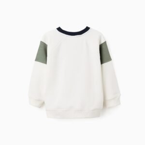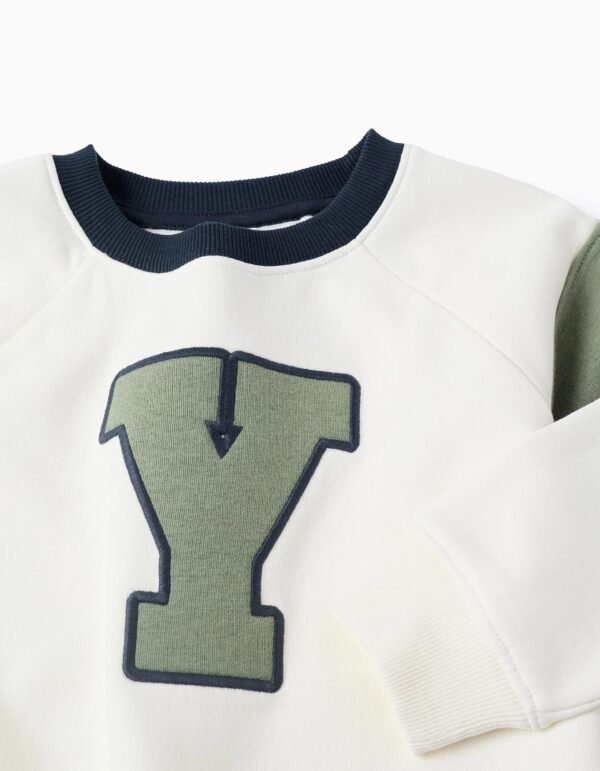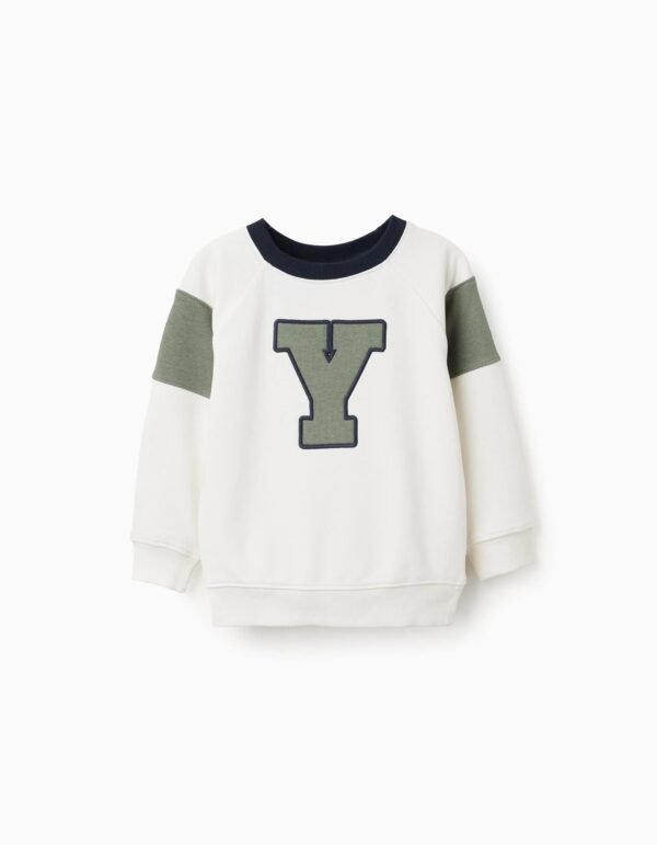 Sudadera blanca para bebé niño, con interior perchado para un mayor confort térmico. Con detalles verdes, en los hombros y en la parte delantera. Cuello azul oscuro. Bordado de una Y en la parte delantera. Hombros caídos para un ajuste relajado. Extremos acanalados para un ajuste perfecto. ¡Una sudadera práctica y original, perfecta para las actividades