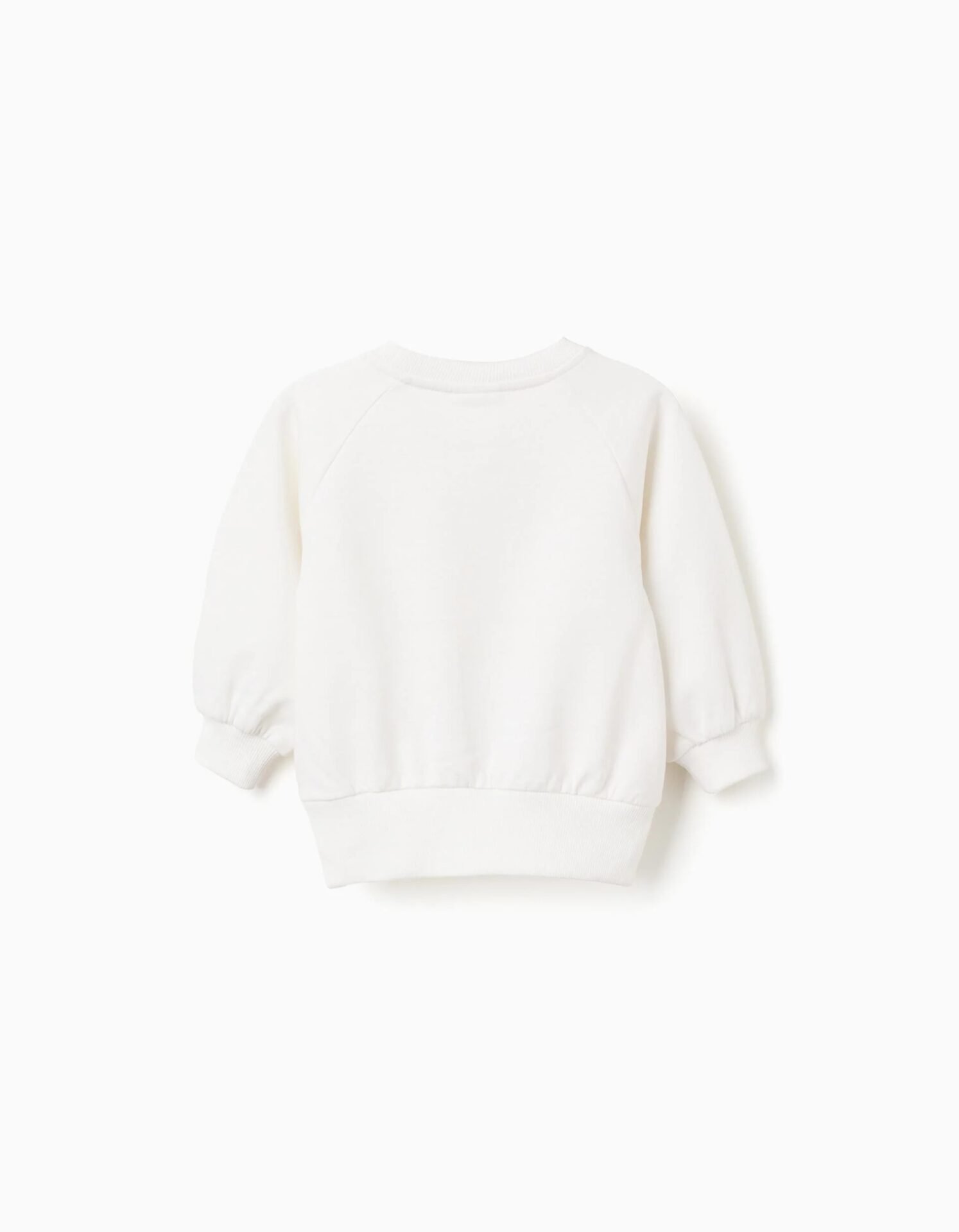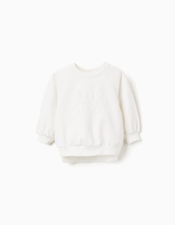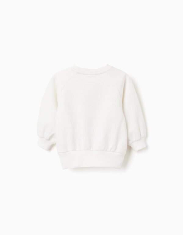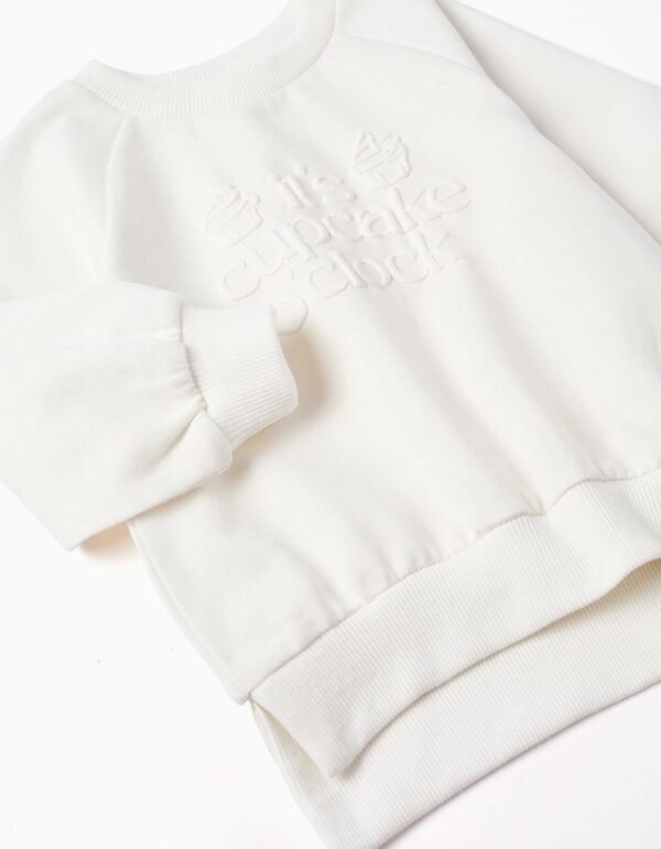 Sudadera blanca para niña, en mezcla de algodón, para un tacto suave y cómodo. Estampado de lazo en relieve. Mangas ranglán. Extremos acanalados, para un ajuste perfecto. Aberturas laterales en la base. Bajo asimétrico con espalda ligeramente más larga. ¡Una sudadera cómoda y ideal para salidas en familia!