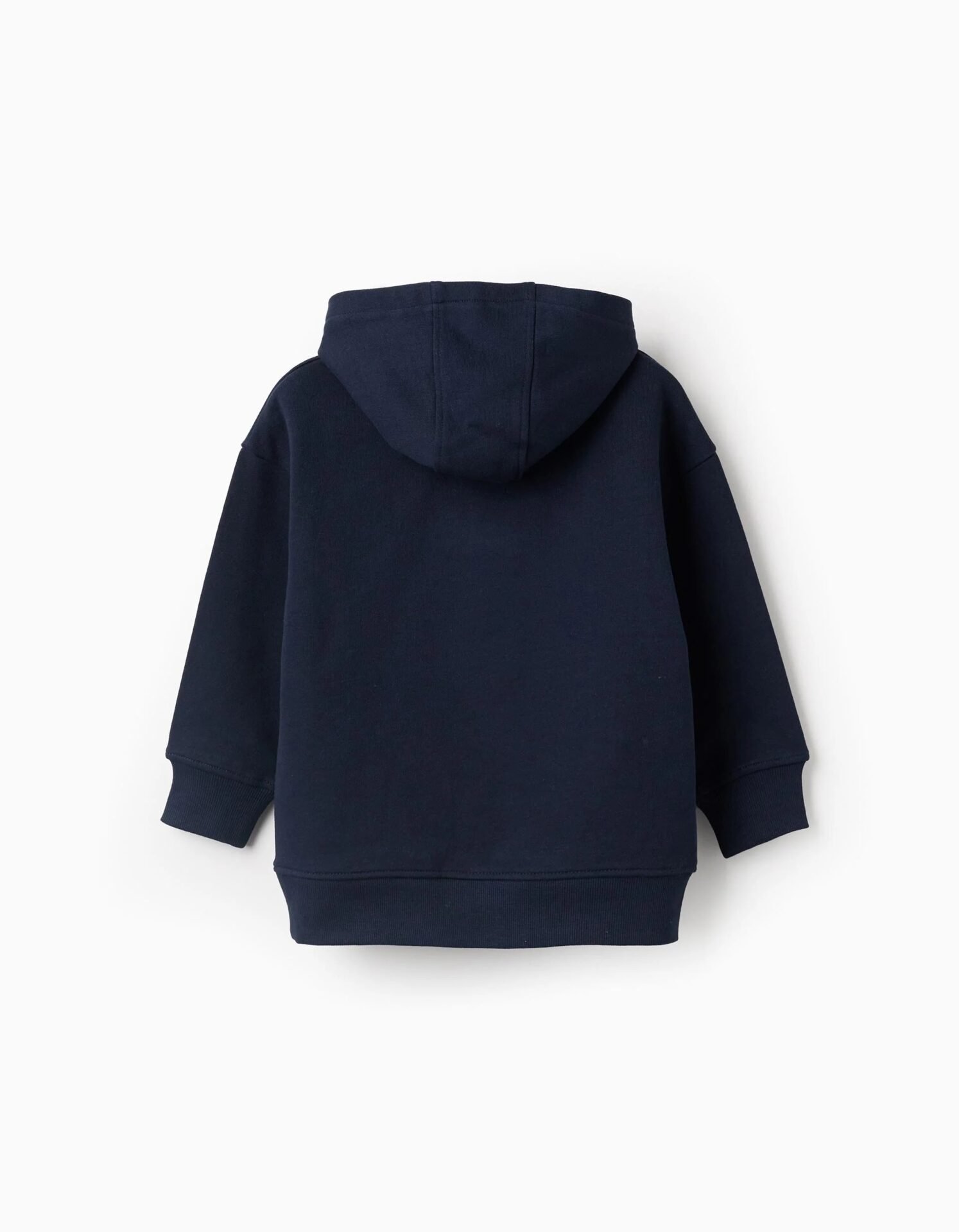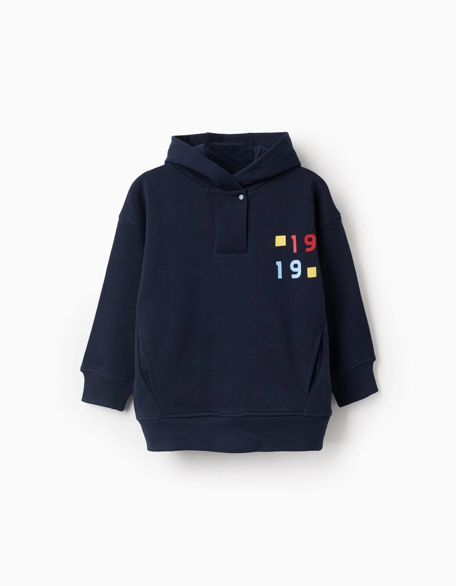 Sudadera con capucha azul oscuro para niño, 100% algodón. Abertura en el cuello con botones de presión. Detalle estampado en el pecho. Bolsillos laterales. Bordes de canalé para un ajuste perfecto. ¡Para todos los estilos!