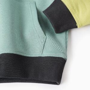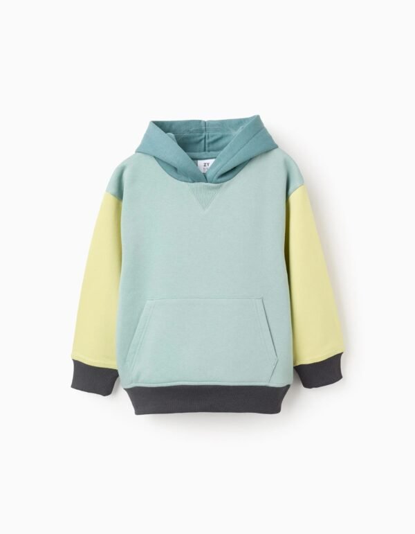 Sudadera multicolor con capucha para niño, con torso verde agua, mangas amarillas y dobladillo gris. Interior perchado para mayor confort térmico. Bolsillo canguro y hombros caídos. Bordes acanalados para un ajuste perfecto. Acogedora, relajada y original. We Care: artículo con certificación Oeko-Tex Standard 100, que garantiza la ausencia de sustancias nocivas o irritantes para la piel.
