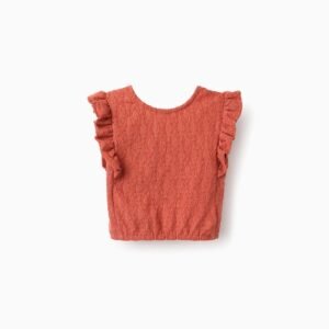 Este top sin mangas naranja para niña es perfecto para los días más cálidos, ya que combina comodidad y originalidad. Los volantes alrededor de los hombros añaden un toque especial a cualquier conjunto, lo que lo hace perfecto para fiestas de cumpleaños o salidas familiares.