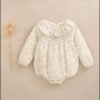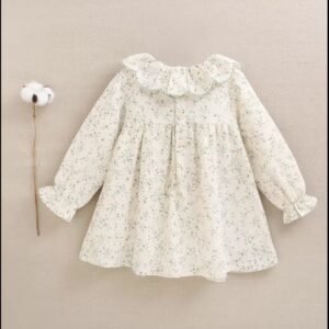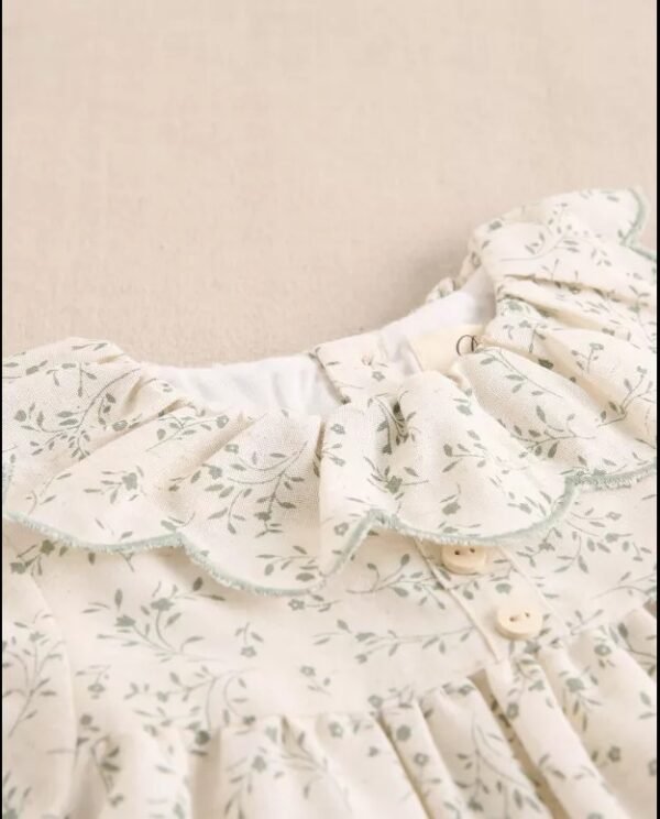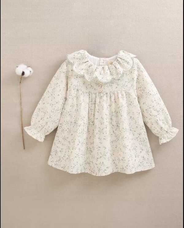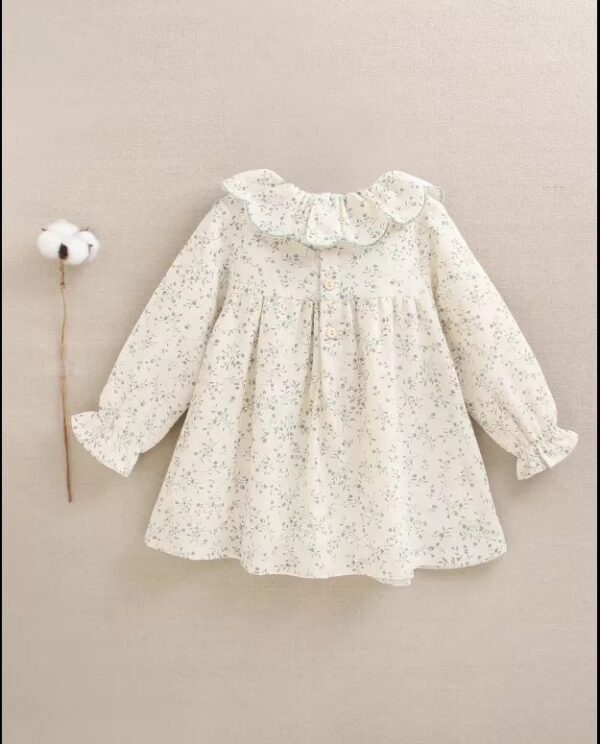 Vestido de bebé niña evasé crudo con estampado floral verde, volante con ondas en cuello y manga larga, puño elástico, forro interior y cierre con botones.