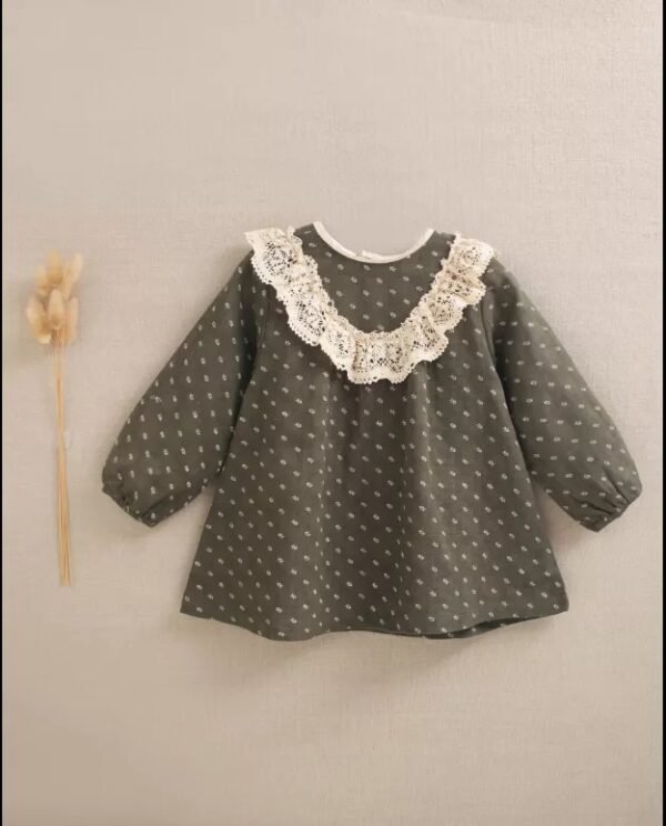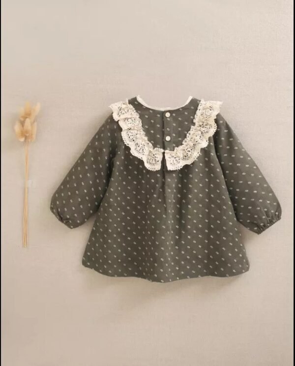 Vestido de bebé niña evasé verde con estampado hojas, cuello redondo, puntilla en la parte delantera y ganchillo, manga larga y cierre trasero con botones.