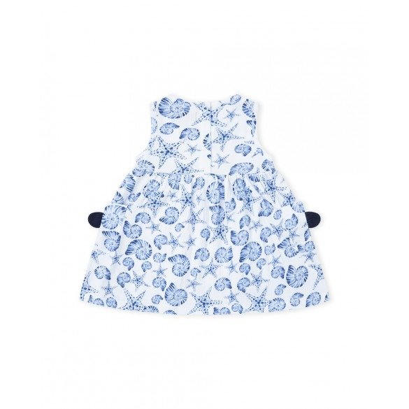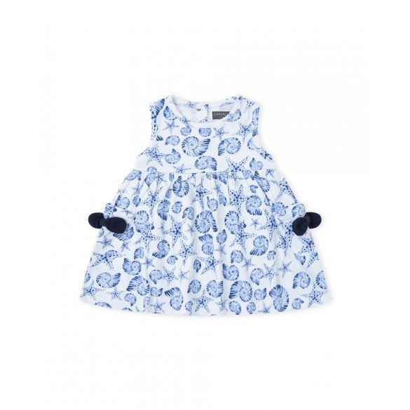 Vestido niña bebe con estampado de caracolas y estrellas de mar azul y blanco de Canada House.