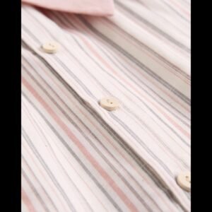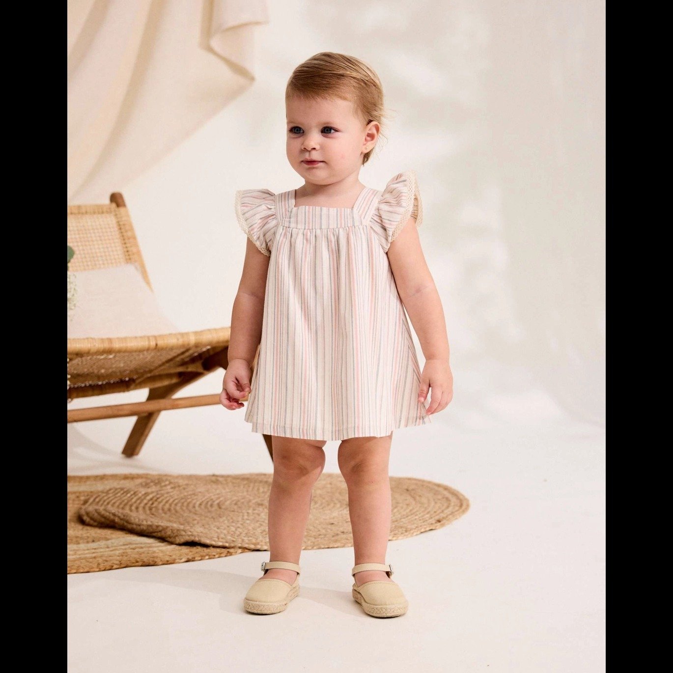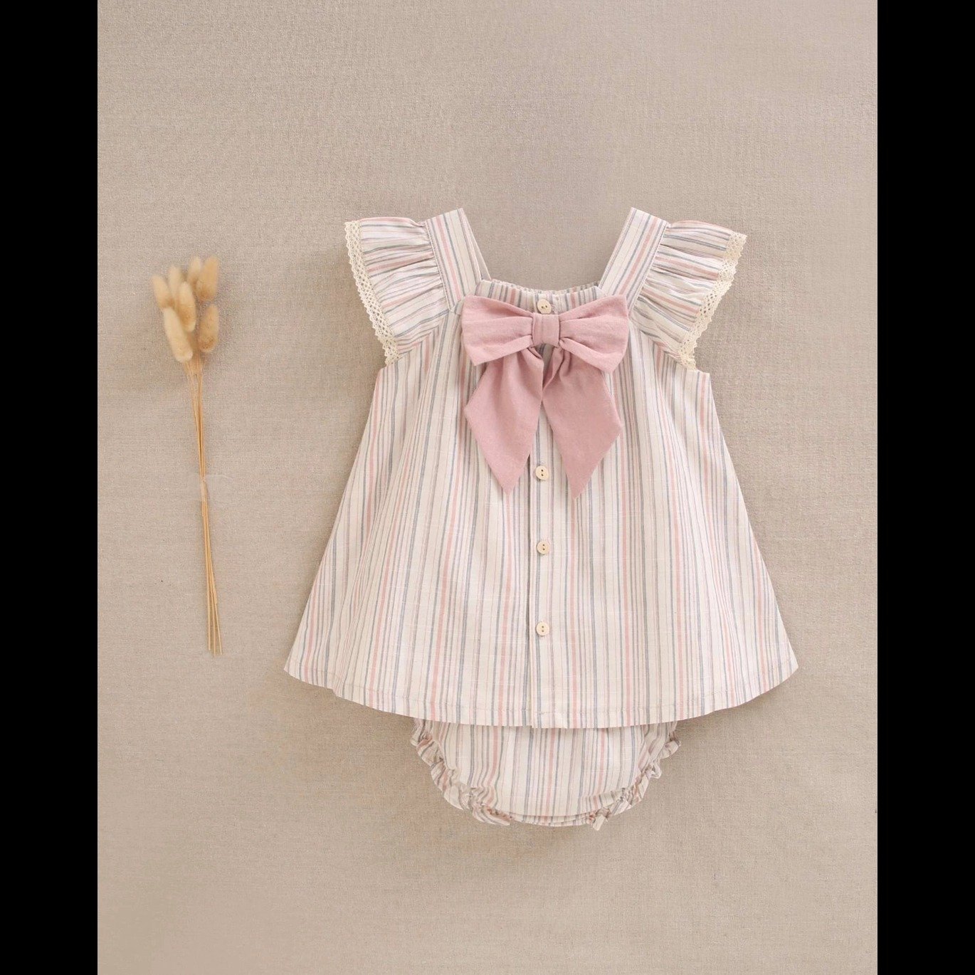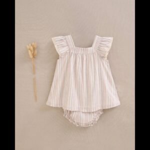 Vestido de bebé niña de rayas rosa y gris con cuello cuadrado y volantes en tirantes. Incluye braguita a juego y cierre trasero con botones de madera.