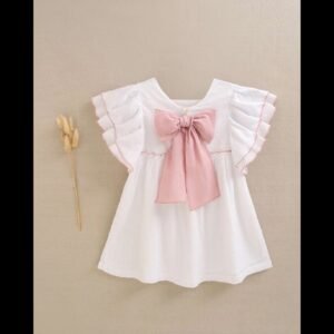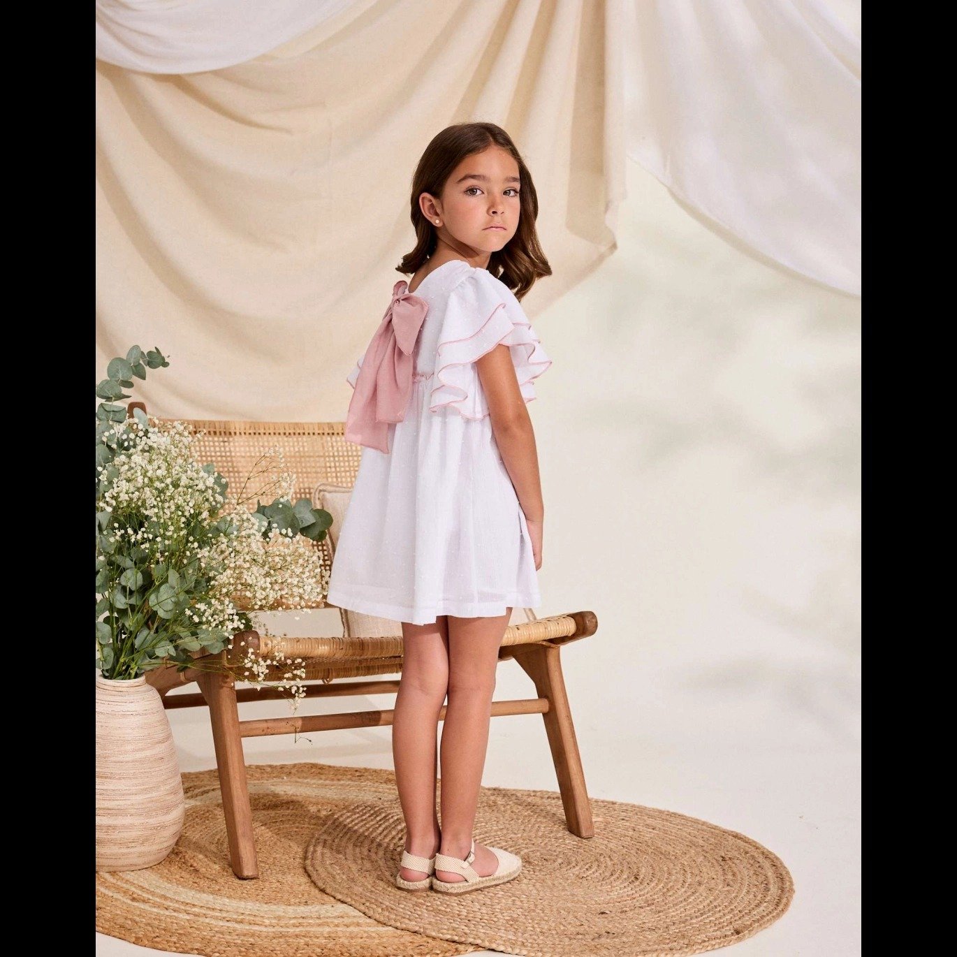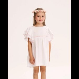 Vestido de niña de plumeti blanco con volantes en las mangas. Fresco, cómodo y elegante, ideal para los días de verano. Perfecto para cualquier ocasión.