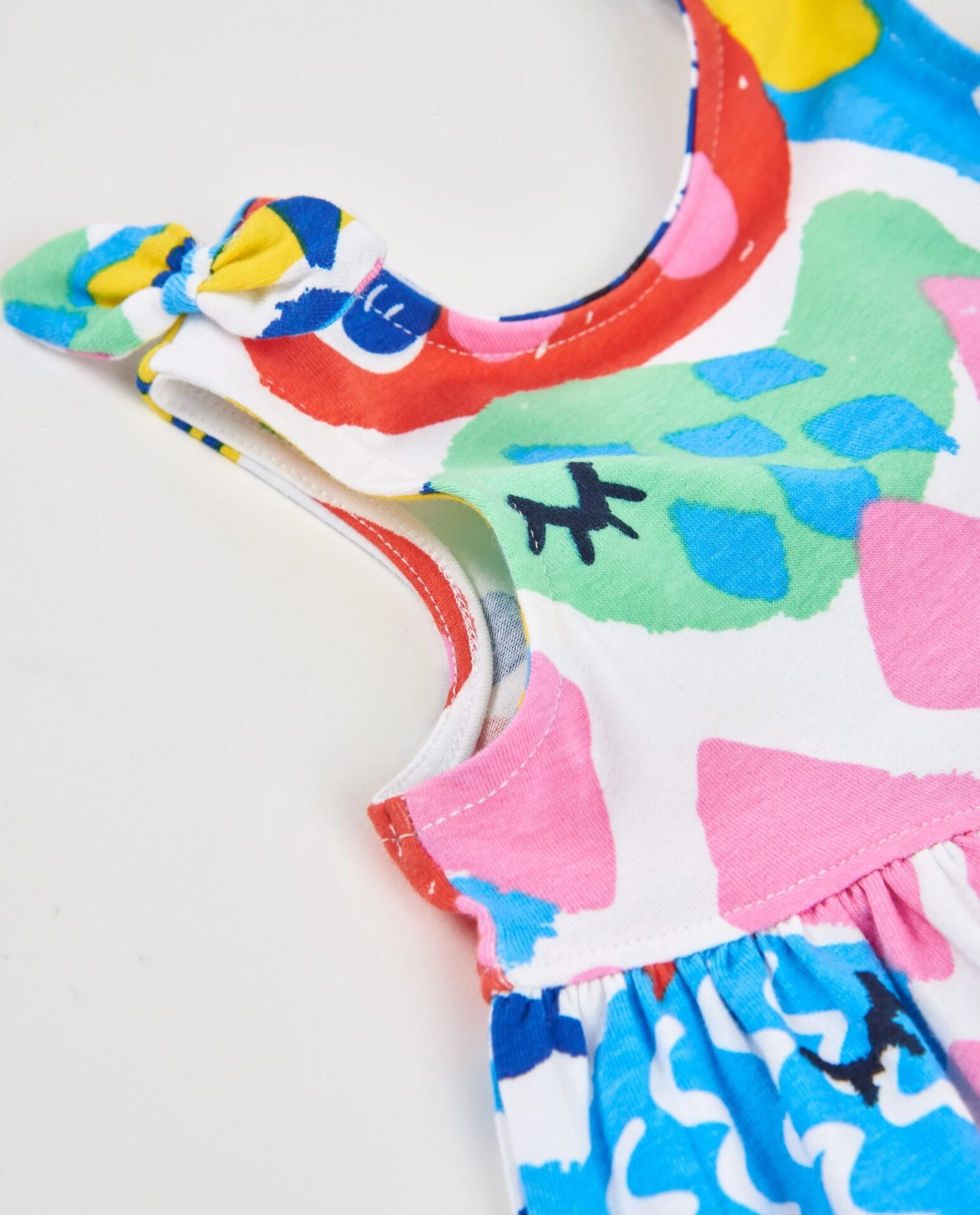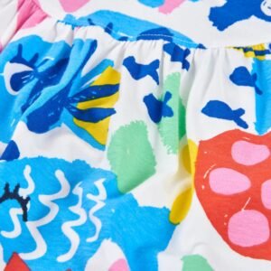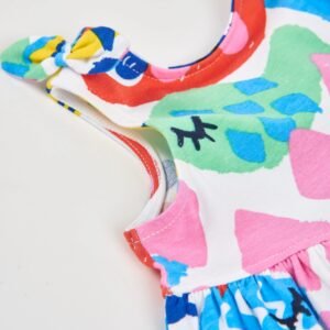 Vestido de niña en un llamativo estampado multicolor inspirado en el mundo marino, confeccionado en un tejido suave y ligero ideal para los días cálidos. Presenta un diseño sin mangas con tirantes anudados, que aportan un toque fresco y encantador a la prenda. La falda amplia con vuelo ofrece comodidad y libertad de movimiento, haciendo que sea perfecto para el día a día o para ocasiones especiales de verano. Un vestido alegre, cómodo y lleno de color que encantará a las pequeñas.