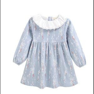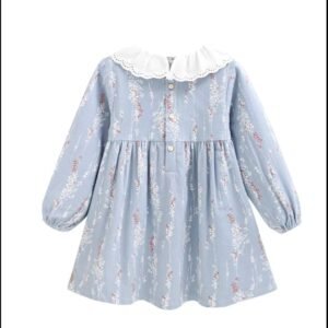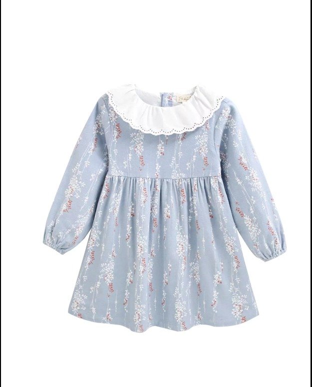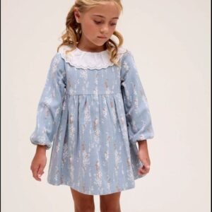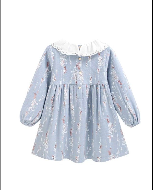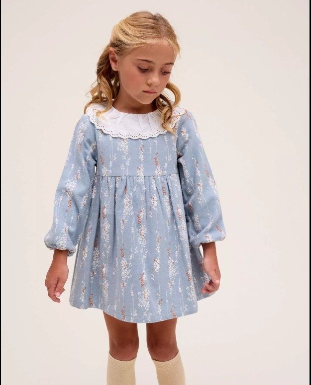 Vestido de niña corte evasé azul con estampado floral blanco y naranja, cuello con volante bordado blanco, manga larga y cierre con botones.