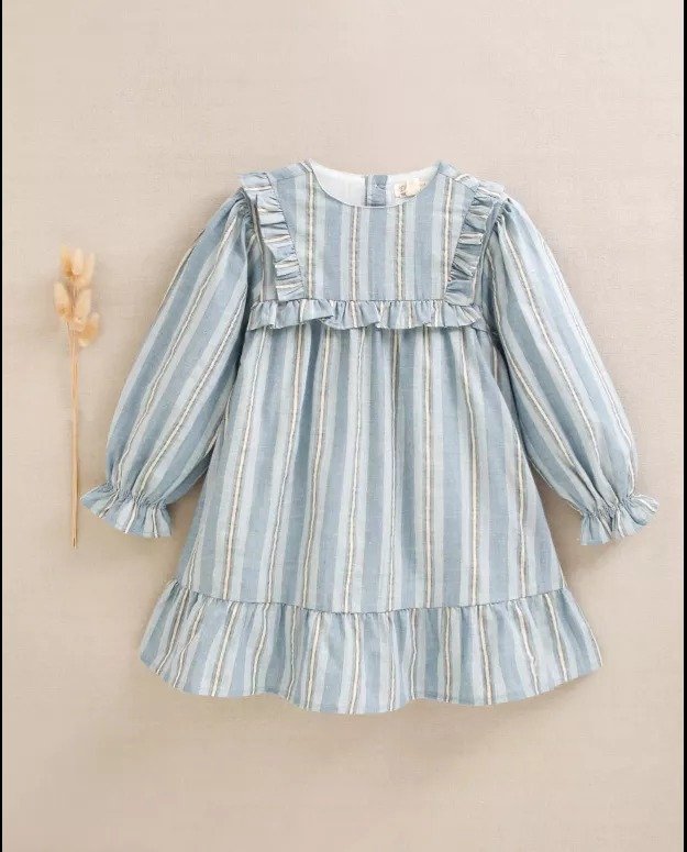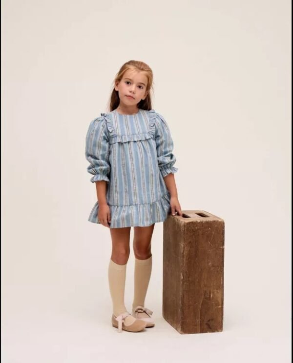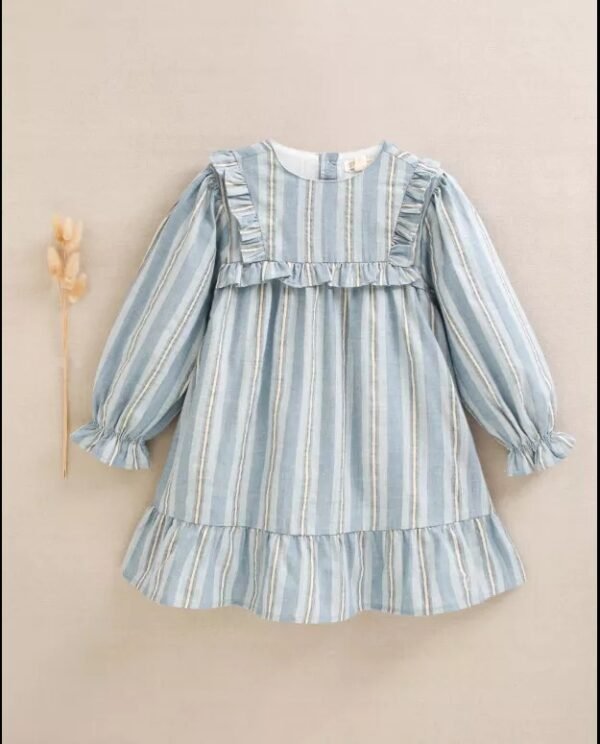 Vestido de niña corte evasé rayas azul, blancas y doradas con brillo, manga larga, cuello redondo, volantes en la parte delantera y cierre en la espalda.