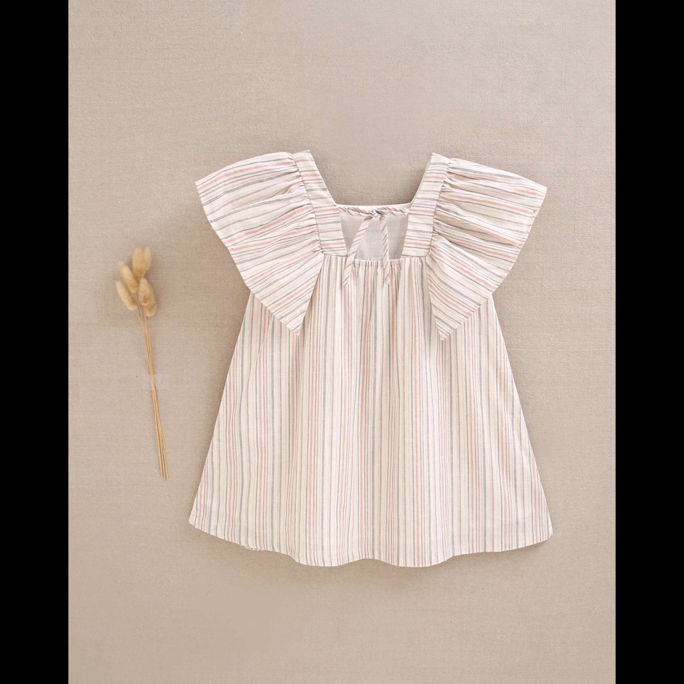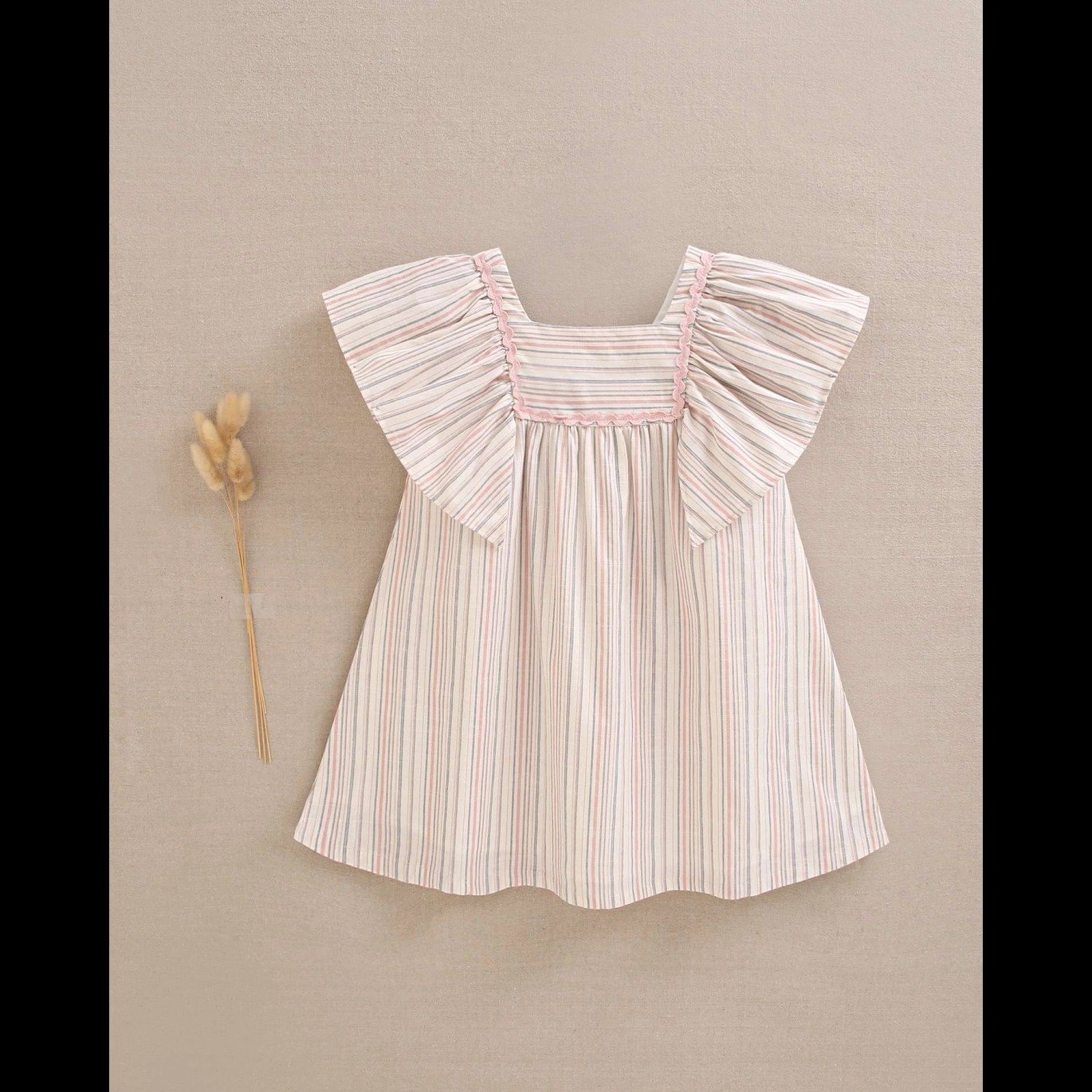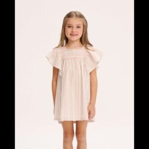Vestido de niña de rayas rosa y gris con ribete central en rosa pastel en el pecho, cuello cuadrado y manga volante amplia. Cierre con botones de madera.