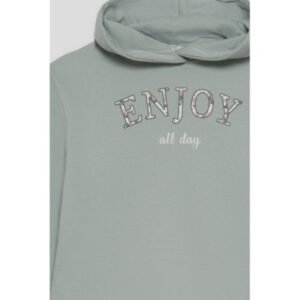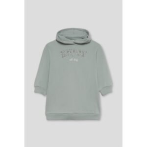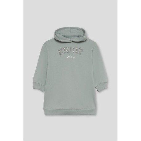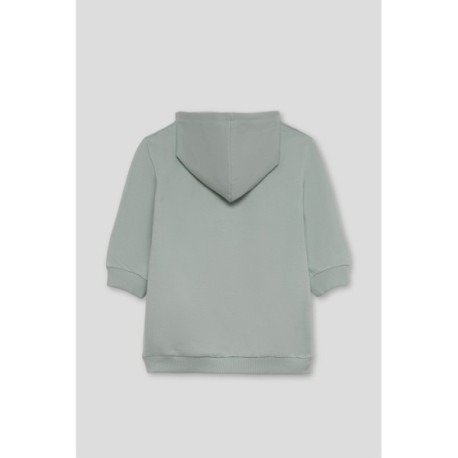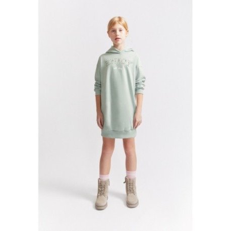 Vestido tipo sudadera para chica color verde iceberg con capucha y manga larga. Diseño relajado con hombros caídos, puños y bajo en canalé.