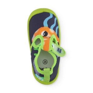 Calzado acuático de niño en color verde lima, diseñado para acompañarle en sus juegos dentro y fuera del agua. Fabricado con un material flexible y de secado rápido, ofrece una sensación ligera y cómoda durante todo el día. El interior suave ayuda a mantener el pie protegido, mientras que la suela antideslizante proporciona estabilidad en superficies mojadas. El cierre con velcro ajustable facilita poner y quitar el zapato, asegurando además un ajuste firme. Presenta un divertido estampado marino con tonos vibrantes y un personaje ilustrado que aporta un toque simpático y lleno de color. Un calzado práctico y funcional, perfecto para piscina, playa o actividades al aire libre